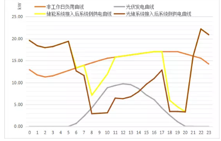 為了獲取最大的經(jīng)濟(jì)效益,儲能系統(tǒng)的主要應(yīng)用模式為用戶分時(shí)電價(jià)管理,利用峰谷電價(jià)差在不同的時(shí)段進(jìn)行充放電??紤]在非夏季的情況下,以非工作日負(fù)荷曲線為標(biāo)準(zhǔn),儲能系統(tǒng)在谷時(shí)段進(jìn)行充電,在峰時(shí)段進(jìn)行放電。因本工程配置風(fēng)力發(fā)電,裝機(jī)規(guī)模為3kW,在儲能的優(yōu)化配置計(jì)算過程中,以負(fù)荷大于光儲發(fā)電出力之和3kW為限制條件。光伏儲能系統(tǒng)接入后的系統(tǒng)側(cè)供電曲線見圖5。