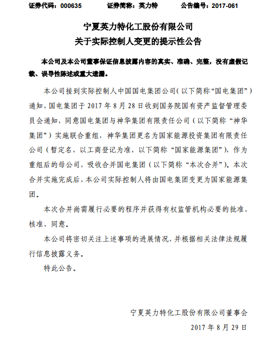 中國(guó)神華、國(guó)電電力、長(zhǎng)源電力、龍?jiān)醇夹g(shù)、英力特等實(shí)控人將變更為國(guó)家能源集團(tuán)
