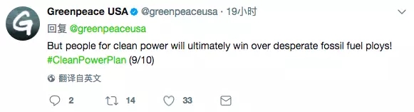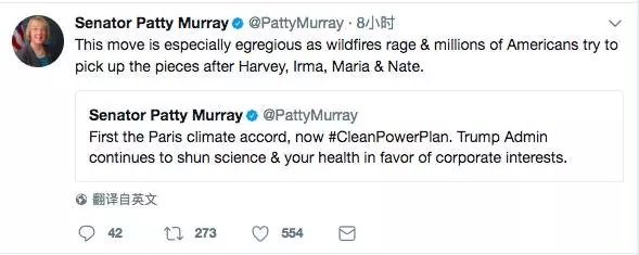 “先是《巴黎協(xié)定》,現(xiàn)在輪到了#清潔電力計(jì)劃,川普一直在為了大公司的利益來回避氣候變化的科學(xué)性和公眾健康問題。在美國各地森林火災(zāi)頻發(fā)以及數(shù)以百萬的美國人遭受著哈維,厄瑪,瑪麗亞還有內(nèi)特等颶風(fēng)氣候?yàn)?zāi)害的時候,這一舉動尤其過分。”