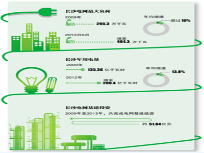 2009年以來,長(zhǎng)沙電網(wǎng)最大負(fù)荷從295.3萬千瓦,上升至464.3萬千瓦,年均增速超過10%;年用電量從135.36億千瓦時(shí)上升至2012年的200.4億千瓦時(shí),年均增速達(dá)13.8%。目前長(zhǎng)沙最大用電負(fù)荷,約相當(dāng)于全省最大用電負(fù)荷的五分之一。