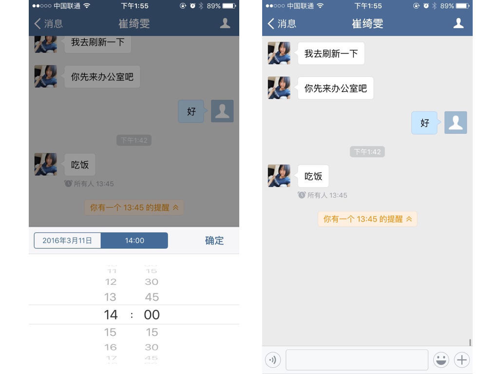 對(duì)話框中的提醒功能,可以設(shè)定某個(gè)對(duì)話的提醒時(shí)間,也就是說,對(duì)方會(huì)在你設(shè)定的時(shí)間點(diǎn)再收到提醒。