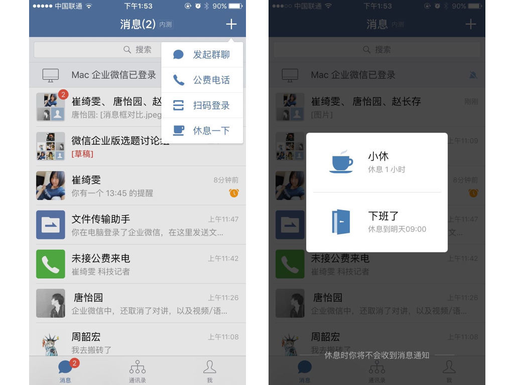 和微信 24 小時(shí)在線的邏輯不同,企業(yè)微信首頁菜單里還加入了一個(gè)名為“休息一下”的功能。員工可以選擇“小休”或“下班了”。在這個(gè)休息期間,員工將分別可在 1 小時(shí)內(nèi)和第二天早上 9 點(diǎn)前不接受來自企業(yè)微信的提醒。