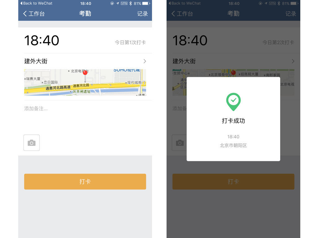 還有一個(gè)比較可怕的打卡功能,就是直接抓取員工的地理位置打卡,也可以作為考勤的一部分,員工不能手動(dòng)調(diào)整距離太遠(yuǎn)的位置來打卡。