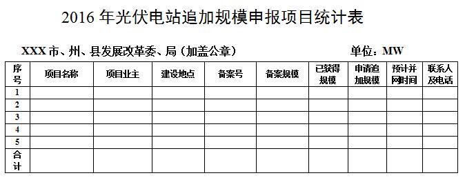 5、市、州發(fā)改委(能源局、辦)申報文件及《2016年光伏電站追加規(guī)模申報項目統(tǒng)計表》(見附件3)。