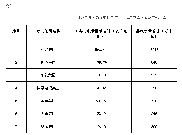3. 各發(fā)電集團燃煤電廠參與本次試點電量限值及裝