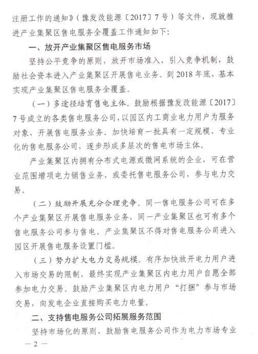 河南省發(fā)改委日前發(fā)布了《關(guān)于推進產(chǎn)業(yè)集聚區(qū)售電服務(wù)全覆蓋工作的通知》,通知中稱,將推進產(chǎn)業(yè)集聚區(qū)售電服務(wù)工作全覆蓋。