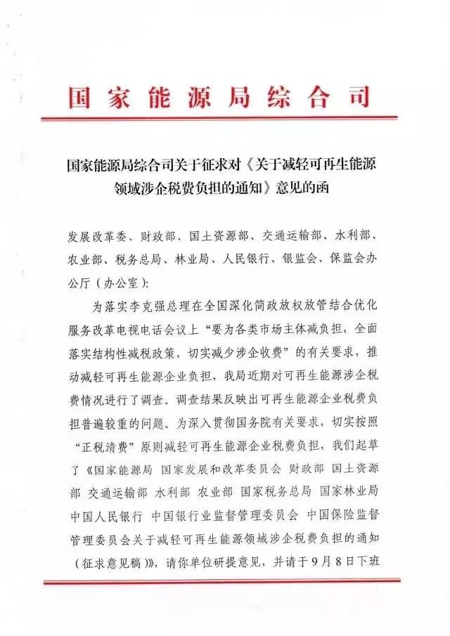 近日,國(guó)家能源局綜合司下發(fā)了關(guān)于征求對(duì)《關(guān)于減輕可再生能源領(lǐng)域涉企稅費(fèi)負(fù)擔(dān)的通知》(以下簡(jiǎn)稱《通知》)意見(jiàn)的函?!锻ㄖ犯鶕?jù)可再生能源企業(yè)稅費(fèi)負(fù)擔(dān)普遍較重的實(shí)際情況,明確了可再生能源企業(yè)的稅費(fèi)減免