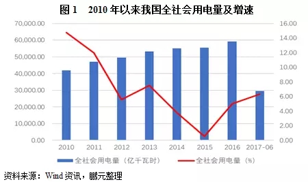 主要內(nèi)容:2016年下半年以來國內(nèi)工業(yè)生產(chǎn)狀況好轉(zhuǎn),全社會用電量增速有所回升。2016年以來,受主要工業(yè)品庫存回補(bǔ)、高能耗行業(yè)開工狀況有所恢復(fù)和基建投資增長帶動等因素影響,全社會用電量回升。2016年全國全社會用電量59,198億千瓦時,比上年增長5.01%,增速較上年提高4.49個百分點;2017年1-6月全社會用電量29,508億千瓦時,同比增長6.3%。