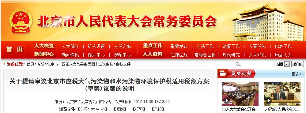 關(guān)于提請(qǐng)審議北京市應(yīng)稅大氣污染物和水污染物環(huán)境保護(hù)稅適用稅額方案(草案)議案的說(shuō)明
