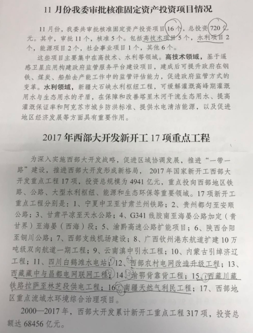 12月18日,國家發(fā)改委新聞發(fā)言人孟瑋在國家發(fā)改委定時主題發(fā)布會上介紹,11月份,國家發(fā)改委共審批核準(zhǔn)固定資產(chǎn)投資項目16個,總投資720億元,這些項目主要集中在高技術(shù)、水利等領(lǐng)域。今年西部大開發(fā)新開工的17項