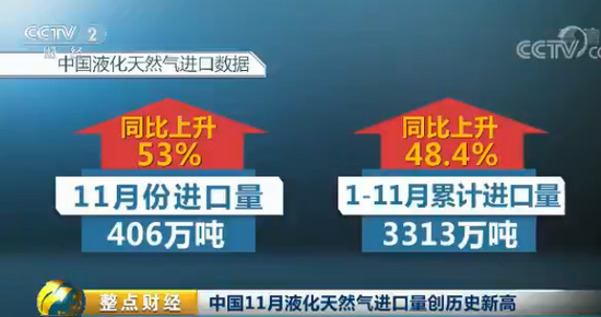 中國海關(guān)周六公布的數(shù)據(jù)顯示,我國11月份液化天然氣進(jìn)口量達(dá)到了406萬噸,同比上升53%,創(chuàng)下歷史新高。而1到11月份液化天然氣進(jìn)口累計(jì)上升了48.4%,達(dá)到了3313萬噸。