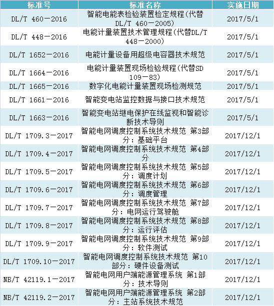 2017年共計(jì)實(shí)施了包括智能電能表檢驗(yàn)裝置檢定規(guī)程(代替DL/T 460—2005)、電能計(jì)量裝置技術(shù)管理規(guī)程(代替DL/T 448—2000)、電能計(jì)量設(shè)備用超級電容器技術(shù)規(guī)范、電能計(jì)量裝置現(xiàn)場檢驗(yàn)規(guī)程(代替SD 109—83)、數(shù)字化電能計(jì)量裝置現(xiàn)場檢測規(guī)范、智能變電站監(jiān)控?cái)?shù)據(jù)與接口技術(shù)規(guī)范、智能變電站繼電保護(hù)在線監(jiān)視和智能診斷技術(shù)導(dǎo)則、智能電網(wǎng)調(diào)度控制系統(tǒng)技術(shù)規(guī)范 第3部分:基礎(chǔ)平臺、智能電網(wǎng)調(diào)度控制系統(tǒng)技術(shù)規(guī)范 第4部分、智能電網(wǎng)調(diào)度控制系統(tǒng)技術(shù)規(guī)范 第5部分:調(diào)度計(jì)劃、智能電網(wǎng)用戶端能源管理系統(tǒng) 第1部分:技術(shù)導(dǎo)則、智能電網(wǎng)用戶端能源管理系統(tǒng) 第2部分:主站系統(tǒng)技術(shù)規(guī)范等265項(xiàng)電力相關(guān)行業(yè)標(biāo)準(zhǔn)。