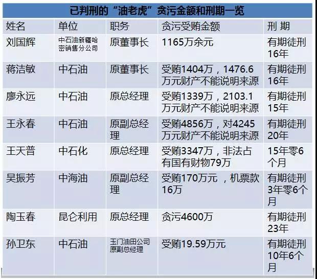 據(jù)初步查詢,在這些被打 “油老虎”中,劉國輝侵占本單位財產(chǎn)共計1165萬余元,被判處有期徒刑16年;陶玉春貪污4600萬元,被判處有徒刑23年,處罰金750萬元;王永春非法收受款物4856萬元,對4245萬財產(chǎn)不能說明來源,被判有期徒刑二十年;蔣潔敏收受賄賂折合1404萬元,另有1476.6萬元的巨額財產(chǎn)不能說明來源,被判處有期徒16年;廖永遠非法收受財物1339.4萬余元,2103.1萬余元財產(chǎn)不能說明來源,被判處有期徒刑十五年;王天普非法收受財物3347萬元,非法占有國有財物79萬元,被判有期徒刑15年六個月;吳振芳伙同張麗娟非法收受財物170萬元,機票款16萬余元,吳振芳被判有期徒刑三年6個月;孫衛(wèi)東受賄19.59萬元,被判有期徒刑十年六個月,沒收個人財產(chǎn)人民幣10萬元。