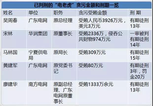 電力領域,吳周春收受賄賂共人民幣3926萬元,美元3萬元,被判處有期徒刑13年;宋林侵吞公共財物974萬元,非法收受財物2336萬元,一審被判有期徒刑14年;馬林國受賄309萬余元,被判處有期徒刑15年;黃建軍受賄80萬元,判處有期徒刑3年,罰金20萬元;廖建華收受賄賂款1333萬余元,被判有期徒刑13年,罰金300萬元。