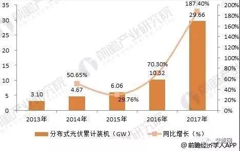圖表3:2013-2017年分布式光伏累計裝機(jī)容量(單位:GW,%)