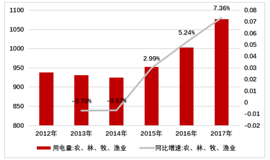 2012-2017 年農(nóng)、林、牧、漁業(yè)用電量(億千瓦時)
