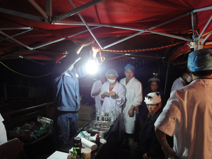 電網(wǎng)員工為醫(yī)療帳篷安裝電燈,點(diǎn)亮帳篷,照亮生命