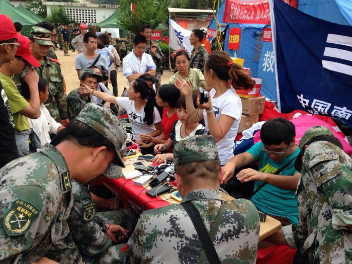 南方電網(wǎng)公司在地震災(zāi)區(qū)設(shè)置了免費(fèi)充電點(diǎn)。謝光輝 殷浩欽 攝