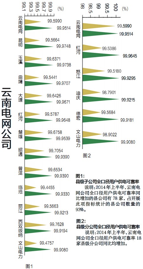 說(shuō)明:2014年上半年,云南電網(wǎng)公司全口徑用戶供電可靠率18家縣級(jí)分公司同比均增加。