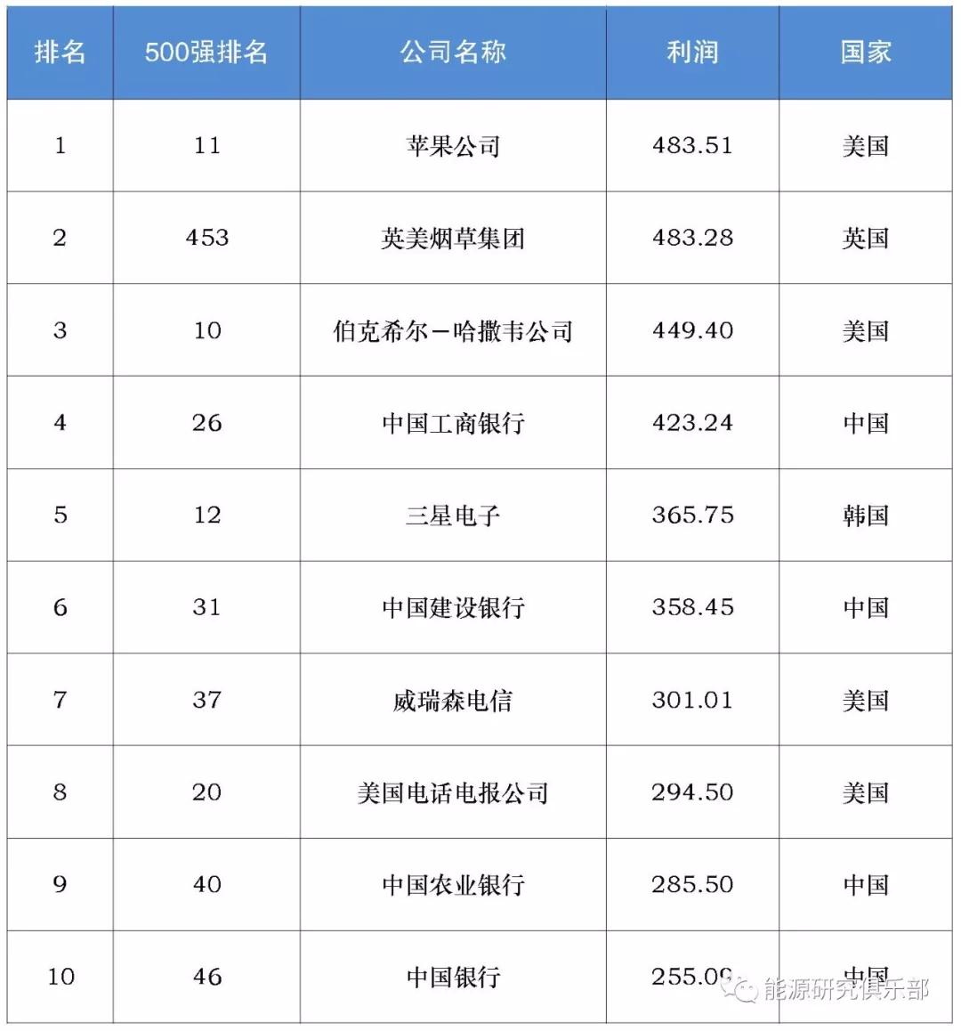 表3 2018年世界500強利潤榜前10名(單位:億美元)