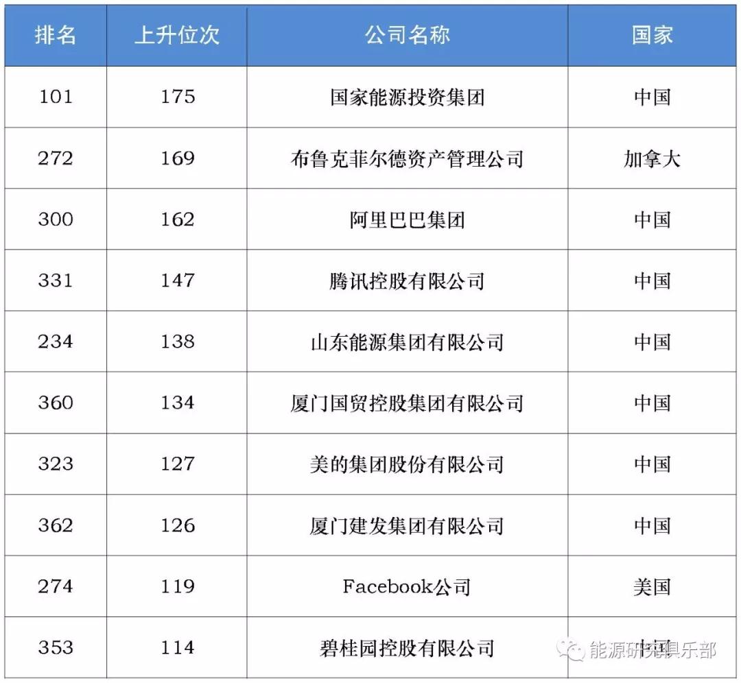 新組建不久的中國國家能源投資集團排名比原神華集團上一年躍升175位,是上升幅度最大的公司。中國企業(yè)在排名上升最快的10家企業(yè)中,占據(jù)8席,表現(xiàn)搶眼。去年前50家公司中躍升最快的是亞馬遜,排名提升了18位。