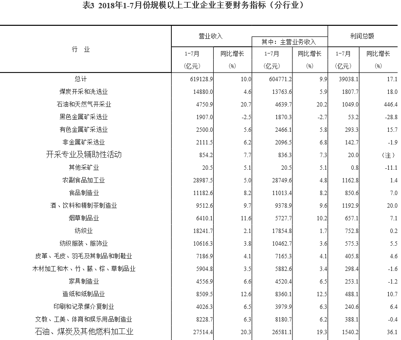 1-7月份,全國(guó)規(guī)模以上工業(yè)企業(yè)實(shí)現(xiàn)利潤(rùn)總額39038 1億元,同比增長(zhǎng)17 1%(按可比口徑計(jì)算,考慮統(tǒng)計(jì)制度規(guī)定的口徑調(diào)整、統(tǒng)計(jì)執(zhí)法增強(qiáng)、剔除重復(fù)數(shù)據(jù)、企業(yè)改革剝離等因素影響,詳見附注二),增速比1-6月份放緩0 1個(gè)百分點(diǎn)。