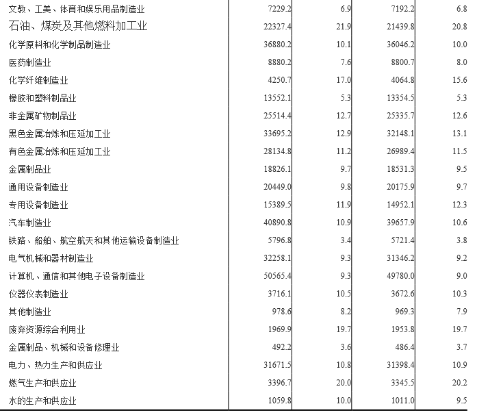 1-7月份,在41個(gè)工業(yè)大類行業(yè)中,32個(gè)行業(yè)利潤(rùn)總額同比增加,9個(gè)行業(yè)減少。主要行業(yè)利潤(rùn)情況如下:煤炭開采和洗選業(yè)利潤(rùn)總額同比增長(zhǎng)18%,石油和天然氣開采業(yè)增長(zhǎng)4.5倍,農(nóng)副食品加工業(yè)增長(zhǎng)1.4%,紡織業(yè)增長(zhǎng)0.2%,石油、煤炭及其他燃料加工業(yè)增長(zhǎng)36.1%,化學(xué)原料和化學(xué)制品制造業(yè)增長(zhǎng)29.2%,非金屬礦物制品業(yè)增長(zhǎng)45.2%,黑色金屬冶煉和壓延加工業(yè)增長(zhǎng)97.8%,通用設(shè)備制造業(yè)增長(zhǎng)9%,專用設(shè)備制造業(yè)增長(zhǎng)23.1%,汽車制造業(yè)增長(zhǎng)1.6%,電氣機(jī)械和器材制造業(yè)增長(zhǎng)1%,計(jì)算機(jī)、通信和其他電子設(shè)備制造業(yè)增長(zhǎng)0.9%,電力、熱力生產(chǎn)和供應(yīng)業(yè)增長(zhǎng)19.6%,有色金屬冶煉和壓延加工業(yè)下降9.8%。