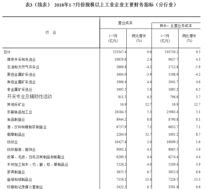 1-7月份,規(guī)模以上工業(yè)企業(yè)實(shí)現(xiàn)主營(yíng)業(yè)務(wù)收入60.5萬億元,同比增長(zhǎng)9.9%;發(fā)生主營(yíng)業(yè)務(wù)成本51.1萬億元,增長(zhǎng)9.5%;主營(yíng)業(yè)務(wù)收入利潤(rùn)率為6.46%,同比提高0.4個(gè)百分點(diǎn)。