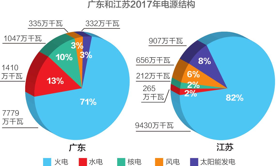 與之對(duì)應(yīng),廣東省2017年全社會(huì)用電量達(dá)到5959億千瓦時(shí),同比增長(zhǎng)6.2%,居全國第一;江蘇省2017年全社會(huì)用電量達(dá)到5808億千瓦時(shí),同比增長(zhǎng)6.4%,居全國第二。兩省用電量合計(jì)占全國全社會(huì)用電量的18.7%。