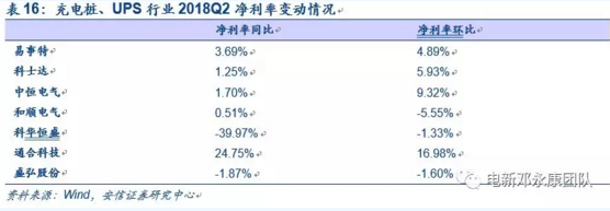 在充電樁和UPS業(yè)務(wù)方面共統(tǒng)計(jì)了7家上市公司,包括易事特、科士達(dá)、中恒電氣、和順電氣、科華恒盛、通合科技和盛弘股份。行業(yè)整體在2018Q2實(shí)現(xiàn)營(yíng)收42.02億元,同比略下降0.52%,環(huán)比增長(zhǎng)80.5%。上半年累計(jì)營(yíng)收65.3億元,較去年同期增長(zhǎng)4.18%。由前幾年單季度情況推測(cè),18年下半年?duì)I收仍可保持同比增長(zhǎng),Q4達(dá)到全年最高點(diǎn)。此外,行業(yè)在2018Q2的歸母凈利潤(rùn)為4.81億元,同比減少24.96%,源于17年Q2基數(shù)大,環(huán)比增長(zhǎng)161.41%。上半年,累計(jì)實(shí)現(xiàn)歸母凈利潤(rùn)6.65億元,同比下降19.98%。