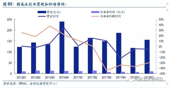 特高壓行業(yè)主要包括3家上市公司(中國(guó)西電、特變電工、平高電氣)。在2018年Q2,共實(shí)現(xiàn)營(yíng)收153.93億元,同比下降5.14%;實(shí)現(xiàn)歸母凈利潤(rùn)9.04億元,同比下降29.7%。從上半年度看,營(yíng)收總計(jì)270.52億元,同比下降4.79%;歸母凈利潤(rùn)總計(jì)15.48億元,同比下降32.9%。從前兩年單季表現(xiàn)看,預(yù)計(jì)18Q3營(yíng)收環(huán)比下降,Q4會(huì)較大幅度回升。