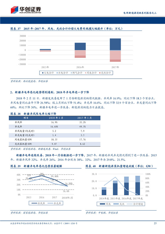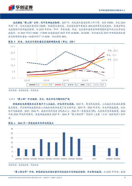 新能源發(fā)電對電網(wǎng)沖擊愈發(fā)強烈。2017年底,我國總發(fā)電裝機容量達到1777GW,其中新能源發(fā)電裝機量比例已達到16.54%。新能源發(fā)電的新增裝機量已經(jīng)從2013年的28GW分三級臺階逐步提升至2017年的68GW,在新增裝機量中的占比達到50%。從2015年開始,我國棄電率水平迅速惡化。2017年,因新增新能源裝機量向中東部地區(qū)轉(zhuǎn)移,沖擊有所減弱。但是,部分省份的棄電率水平仍然在兩位數(shù)以上,并且全國年新增裝機量大概率將維持在60GW以上,對電網(wǎng)沖擊仍然強烈。