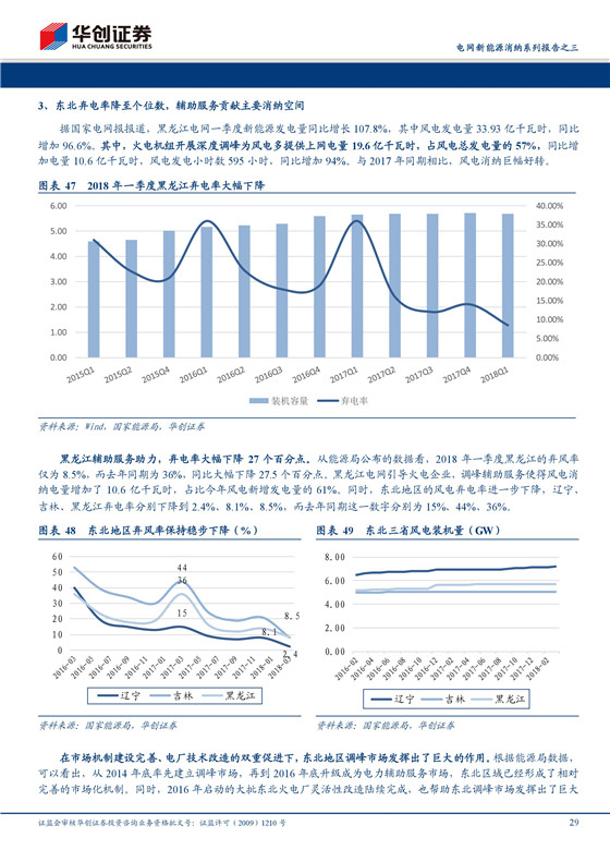 輔助服務(wù)機制調(diào)整,棄電率惡化態(tài)勢得到有效遏制。2015年、2016年,東北、西北地區(qū)的輔助服務(wù)機制開始做出重大調(diào)整,西北地區(qū)大幅提高了服務(wù)補償標(biāo)準(zhǔn),東北地區(qū)建立了市場化報價機制,以火電為主的傳統(tǒng)能源參與電網(wǎng)調(diào)節(jié)的積極性增強,備用、調(diào)峰等工作量明顯提高,兩區(qū)域的棄電率惡化態(tài)勢得到顯著緩解。2018年上半年,全國棄風(fēng)率僅為8.7%,同比下降5個百分點,棄光率3.6%,同比下降3.2個百分點。