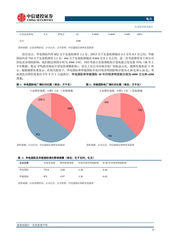 綜合而言,華電國(guó)際約有 852 萬千瓦裝機(jī)降價(jià) 1.1 分, 259.5 萬千瓦裝機(jī)降幅在 0.1 分至 0.5 分之間;華能國(guó)際約有 754 萬千瓦裝機(jī)降價(jià) 1.1 分, 444 萬千瓦裝機(jī)降幅在 0.004 分至 1 分之間。進(jìn)一步考慮降價(jià)對(duì)于兩公司營(yíng)收及業(yè)績(jī)的影響,我們假定利用小時(shí)為 4500 小時(shí),同時(shí)考慮山東統(tǒng)調(diào)機(jī)組計(jì)劃電量占發(fā)電量 53%( 18 年上半年數(shù)據(jù),假定 47%的市場(chǎng)電不受電價(jià)調(diào)整影響),結(jié)合上市公司對(duì)相關(guān)電廠的權(quán)益占比,測(cè)算結(jié)果如表 3 所示。 根據(jù)測(cè)算結(jié)果顯示,在相關(guān)假設(shè)下,華電國(guó)際和華能國(guó)際年化歸母凈利潤(rùn)影響分別為-1.20 億和-1.26 億??紤]到此次降價(jià)政策自今年 9 月 1 日起執(zhí)行, 華電國(guó)際和華能國(guó)際 18 年歸母凈利受損分別為-4000 萬元和-4200萬元。
