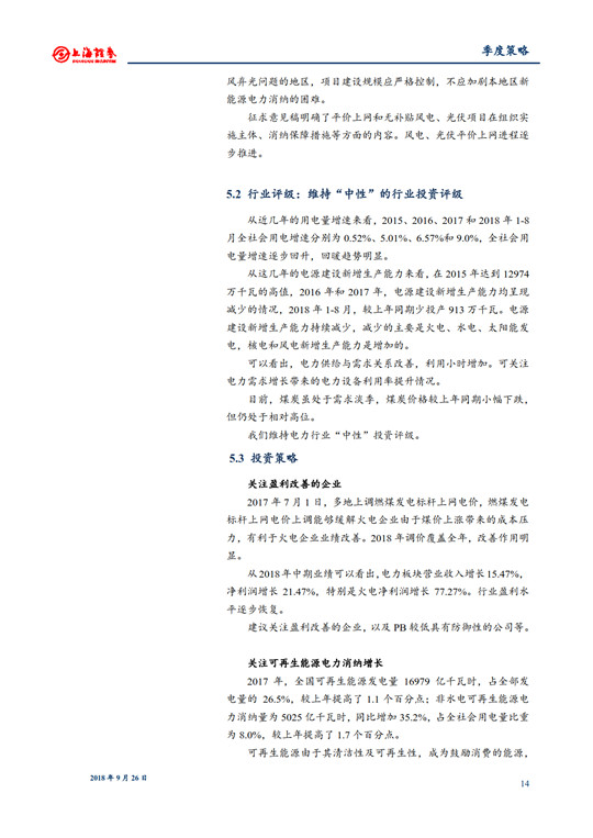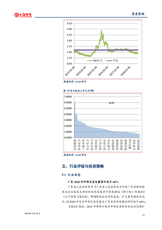 從2018年中期業(yè)績(jī)可以看出,電力板塊營(yíng)業(yè)收入增長(zhǎng)15.47%,凈利潤(rùn)增長(zhǎng)21.47%,特別是火電凈利潤(rùn)增長(zhǎng)77.27%。行業(yè)盈利水平逐步恢復(fù)。建議關(guān)注盈利改善以及PB較低具有防御性公司等。