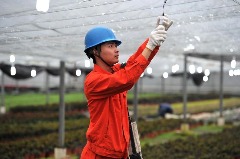 浙江省桐鄉(xiāng)市石門鎮(zhèn)白馬塘村農(nóng)業(yè)科技種植園,桐鄉(xiāng)市供電局石門供電營業(yè)所員工深入花卉茄大棚,幫助檢查設(shè)備和線路,安裝節(jié)能燈,保障用電安全,助力白馬塘村民增收。