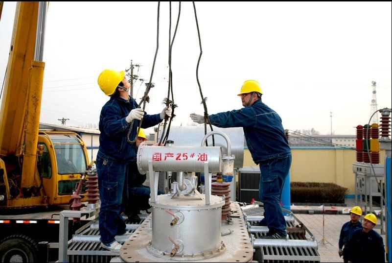 在2號(hào)主變大修作業(yè)區(qū)內(nèi),伴隨著陣陣轟鳴的馬達(dá)聲,變檢工區(qū)員工各就各位,緊張有序地進(jìn)行主變吊芯大修工作。他們首先對(duì)變壓器放油、濾油,隨后拆除主變各類附件、套管、油箱的緊固螺絲后,吊車開(kāi)始作業(yè)將主變鐵芯從油箱內(nèi)緩緩吊運(yùn)至地面一托盤里。鐵芯內(nèi)部螺栓加固,更換密封墊片,做油化耐壓試驗(yàn),鐵芯的絕緣電阻,清洗變壓器油箱和高低壓套管,更換凈油器硅膠等一系列保養(yǎng)工作隨即展開(kāi)。下午17時(shí)30分,經(jīng)反復(fù)多次檢查確認(rèn)無(wú)誤后又將鐵芯安全吊裝回位……