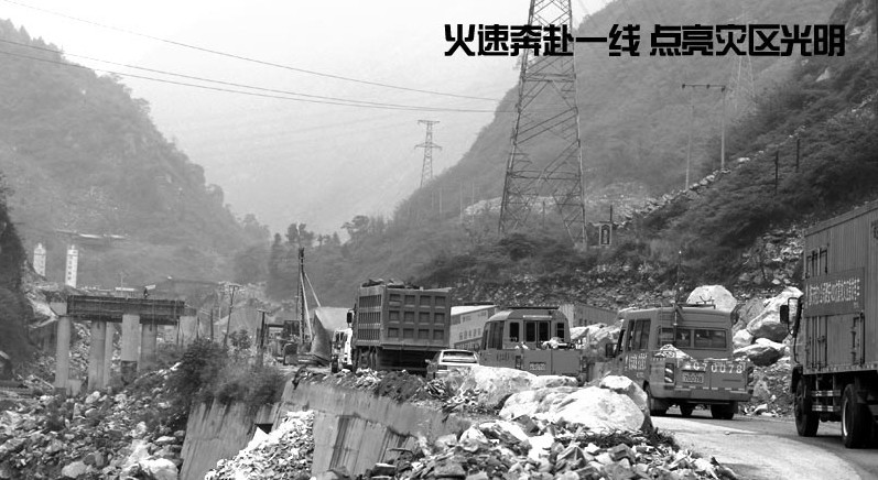 圖1:眉山公司國(guó)網(wǎng)四川電力共產(chǎn)黨員服務(wù)隊(duì)隊(duì)員在災(zāi)區(qū)巡線。作者:王冰如  圖2:國(guó)網(wǎng)重慶電力抗震救援車隊(duì)行進(jìn)在山路上。作者:康新  圖3:四川成都電業(yè)局搶修人員安裝照明燈具。作者:李國(guó)洲  圖4:樂山