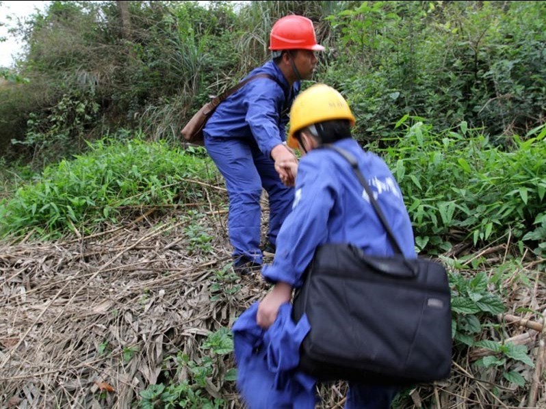 圖1:眉山公司國(guó)網(wǎng)四川電力共產(chǎn)黨員服務(wù)隊(duì)隊(duì)員在災(zāi)區(qū)巡線。作者:王冰如