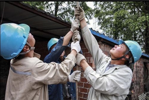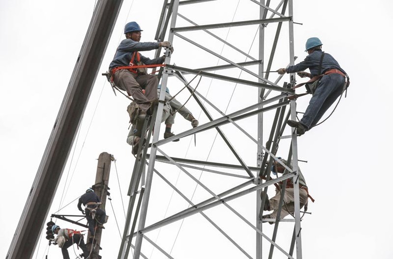 5月27日,江蘇泰州安泰輸變電工程有限公司工作人員正在35千伏口港線88號-90號改造現(xiàn)場組立鐵塔?! ?5千伏口港線工程肩負(fù)著泰州市高港區(qū)務(wù)港局和長江口岸閘口的供電任務(wù)。此線路已投運(yùn)近20年,由于運(yùn)行年限