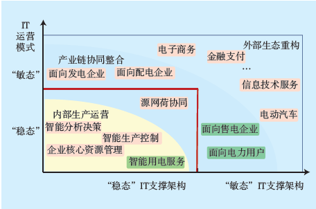 根據(jù)國家電網(wǎng)公司業(yè)務(wù)形態(tài)分布,營銷服務(wù)主要包括內(nèi)部生產(chǎn)運(yùn)營中的智能用電服務(wù)業(yè)務(wù)及產(chǎn)業(yè)鏈協(xié)同整合中的面向電力用戶業(yè)務(wù)[12],因此,對(duì)于營銷服務(wù)的信息通信支撐應(yīng)包括“穩(wěn)態(tài)”IT架構(gòu)、“敏態(tài)”IT架構(gòu),配套“穩(wěn)態(tài)”IT運(yùn)營模式及“敏態(tài)”IT運(yùn)營模式(見圖2)。