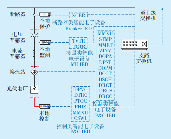 1)IEC61850標準將變電站劃分為過程層、間隔層和變電站層。過程層主要包括智能組件、智能終端元件和合并單元類設備;間隔層主要包括穩(wěn)控裝置、測控裝置、繼電保護裝置和故障錄波裝置等;變電站層設備則主要包括工程師工作站、操作員站監(jiān)控主機、數(shù)據(jù)服務器、數(shù)據(jù)通信網(wǎng)關、綜合應用服務器等。微網(wǎng)數(shù)據(jù)建模同樣需要按照設備功能的不同劃分為3個層次[8]。