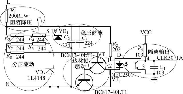 穩(wěn)壓儲能部分電路首先保證光耦兩端電壓穩(wěn)定在5.1V附近,保證光耦D1能夠正常導(dǎo)通和截止的同時又防止光耦擊穿;電容C2、C3充電后,在光耦D1導(dǎo)通時段內(nèi)放電保證光耦發(fā)光管正常發(fā)光。