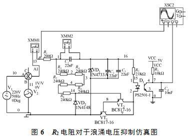 搭建如圖6所示的仿真電路,將浪涌電壓與220VAC疊加后輸入過零檢測電路,觀測接入R2和不接入R2兩種電路下輸出過零點波形。