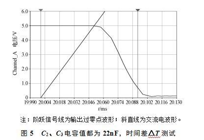 過零檢測電路輸出過零點信號與實際交流電的過零點之間時間差ΔT,如圖5所示,當(dāng)C2、C3電容值都為22nF時,根據(jù)圖中所示,有
