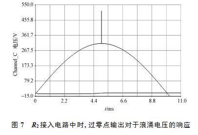 當(dāng)電阻R2接入電路中時,過零點輸出對于浪涌電壓的響應(yīng)如圖7所示。