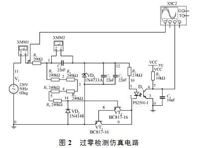 利用Multisim11.0軟件,搭建如圖2所示的仿真電路,用虛擬示波器觀測220VAC,經(jīng)光耦D1隔離后輸出的過零信號、光耦D1波形。