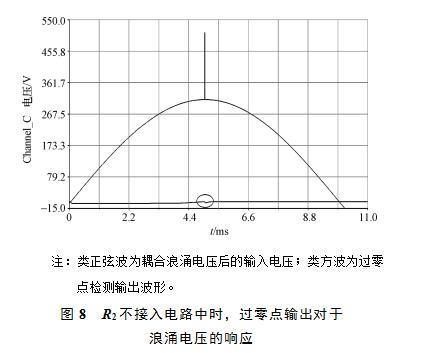 由圖8可知,R2接入電路中時,輸入浪涌電壓并未引起過零點輸出的誤觸發(fā)。