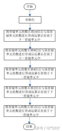 (3)編程時采取字節(jié)順序右移的方式,當溢出1時,與生成多項式進行“異或”運算(對多項式進行編碼時,多項式各冪次的系數(shù)總在模2域內(nèi)做運算,這時加法和減法皆為“異或”運算)。