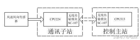 圖1為該通訊系統(tǒng)的結(jié)構(gòu)簡圖,其中風速風向傳感器和控制主站的通訊是通過通訊子站來實現(xiàn)的,通訊子站是由CPU224以及一個無線傳輸模塊SC-107組成,該無線傳輸模塊與主站的無線模塊分別通過通訊子站以及控制主站的COM2口與其連接。
